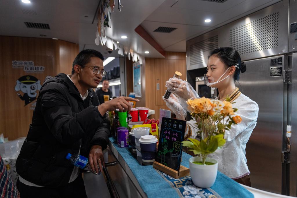 12月2日,一名乘務員在中老鐵路C385次列車上向一名旅客介紹咖啡。新華社記者 陳欣波 攝