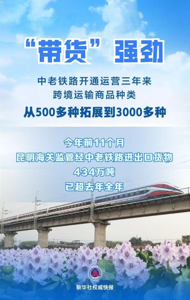 昆明海關發布數據顯示,今年前11個月,昆明海關監管經中老鐵路進出口貨物434萬噸、貨值168.1億元,兩項數據均已超去年全年。