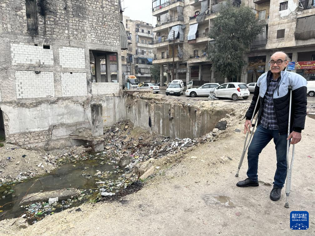 2024年1月26日,在敘利亞阿勒頗,被地震奪去雙腿活動能力的當地居民葉海亞·卡克赫站在遭地震毀壞的房屋旁(手機照片)。新華社記者 冀澤 攝