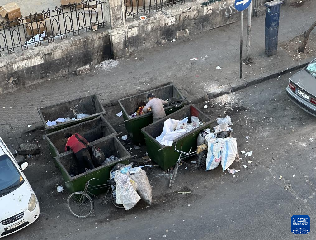 2024年12月3日,在敘利亞大馬士革,兩名少年在垃圾箱中撿拾塑料瓶(手機照片)。新華社記者 冀澤 攝