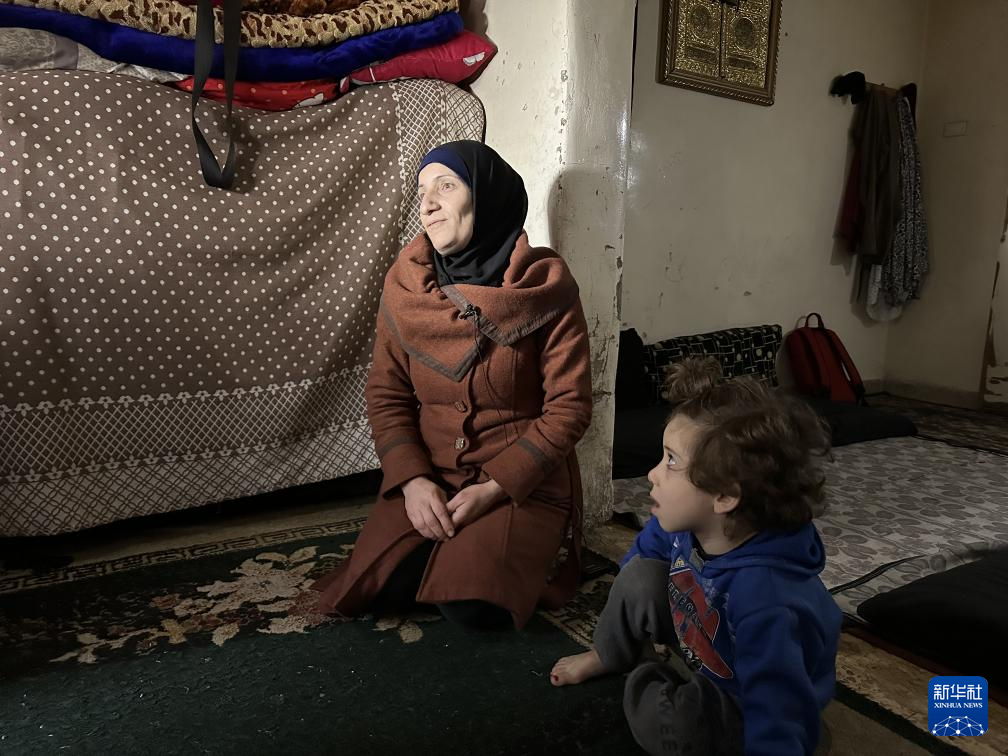 2024年1月24日,在敘利亞阿勒頗,敘利亞人哈迪亞·庫爾迪與女兒在家中,他們依賴人道主義機構的援助維持生計(手機照片)。新華社記者 冀澤 攝