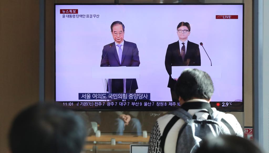 12月8日,在韓國首爾火車站,民眾觀看韓國執政黨黨首韓東勛與國務總理韓德洙(左)共同會見記者的電視直播。新華社記者 姚琪琳 攝