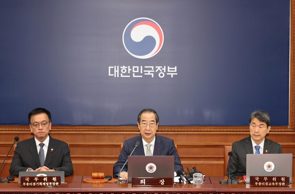 12月14日,在韓國首都首爾,代行總統職權的韓國國務總理韓德洙(中)召開臨時國務會議。新華社/紐西斯通訊社