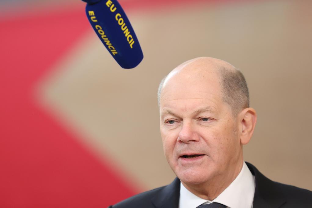 圖為德國總理朔爾茨2月1日在比利時布魯塞爾出席歐盟特別峰會時接受媒體記者采訪。新華社記者趙丁喆攝