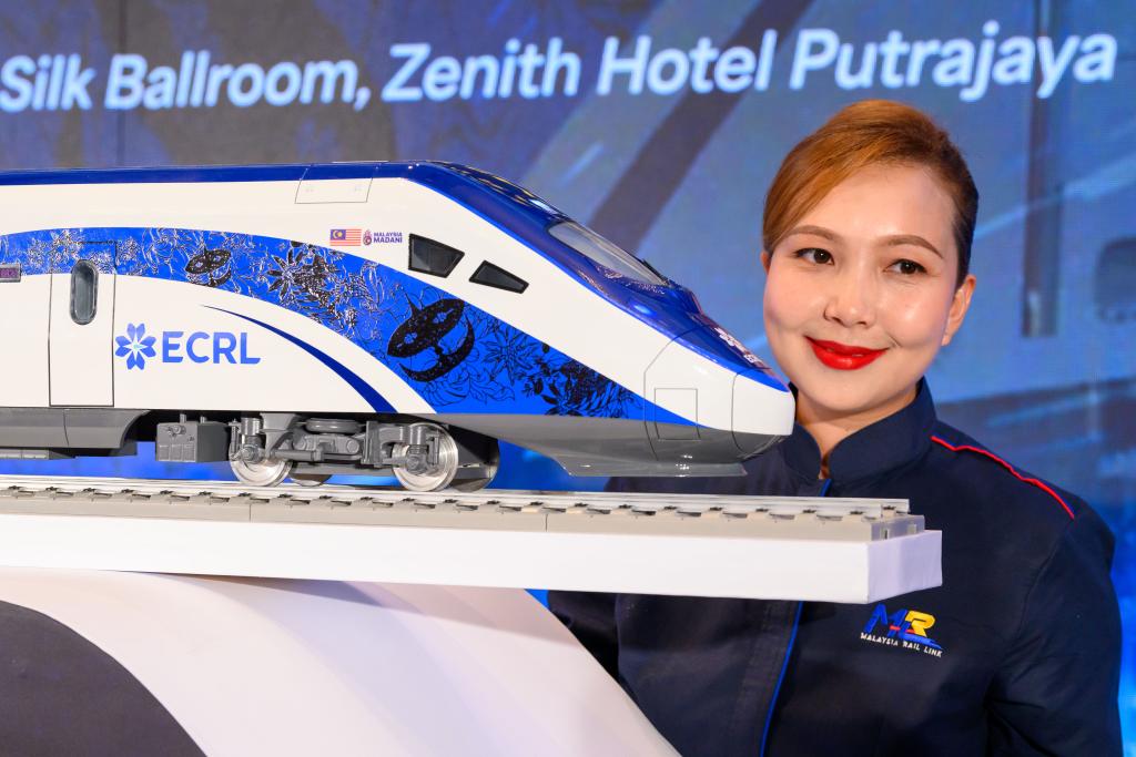 12月18日,在馬來西亞普特拉賈亞,模特與新的動車組模型合影。新華社發(張紋綜攝)