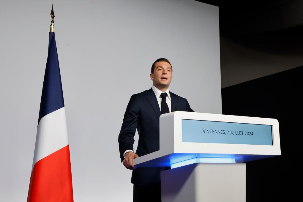 7月7日,極右翼政黨“國民聯盟”主席若爾當·巴爾代拉出席在巴黎舉行的選后集會。 新華社發(亨利·施瓦茨攝)