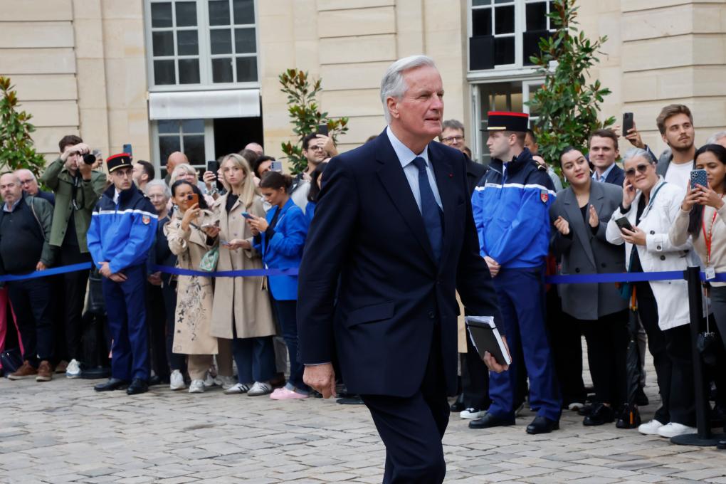 9月5日,在法國首都巴黎的總理府,米歇爾·巴尼耶出席與即將卸任的總理阿塔爾(未在畫面中)的交接儀式。新華社發(亨利·施瓦茨攝)