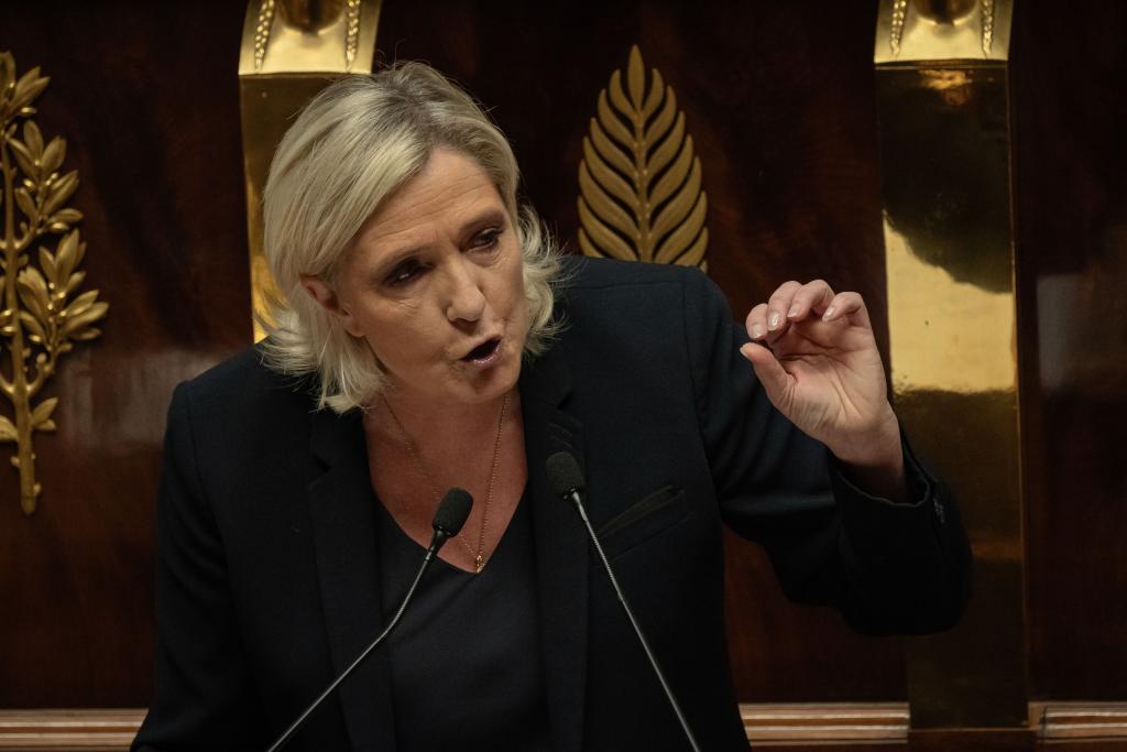 12月4日,在位于法國巴黎的國民議會,法國極右翼“國民聯盟”國民議會黨團主席瑪麗娜·勒龐參加兩項針對政府的不信任動議進行投票表決前的辯論。 新華社發(奧雷利安 莫里薩爾攝)