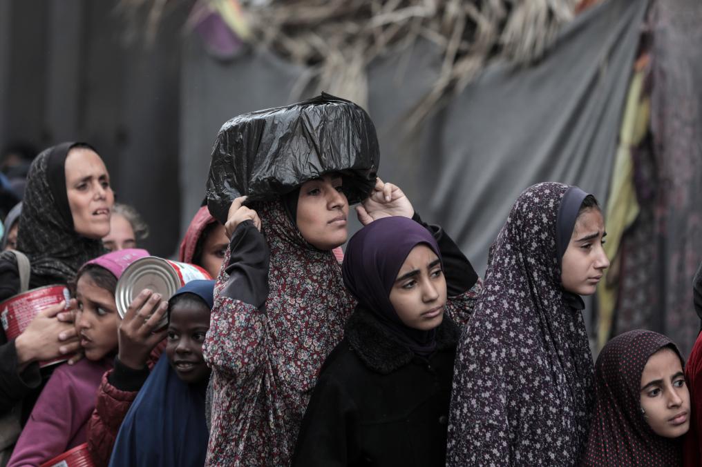 12月20日,巴勒斯坦人在加沙地帶中部代爾拜拉赫排隊等待領取食物。新華社發(里澤克·阿卜杜勒賈瓦德攝)