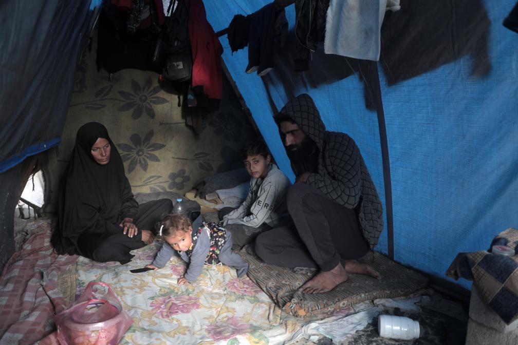 11月28日,在加沙地帶中部城市代爾拜拉赫的海邊,巴勒斯坦人烏代·奧萊瓦(右一)和他的家人在臨時帳篷里生活。新華社發(里澤克·阿卜杜勒賈瓦德攝)