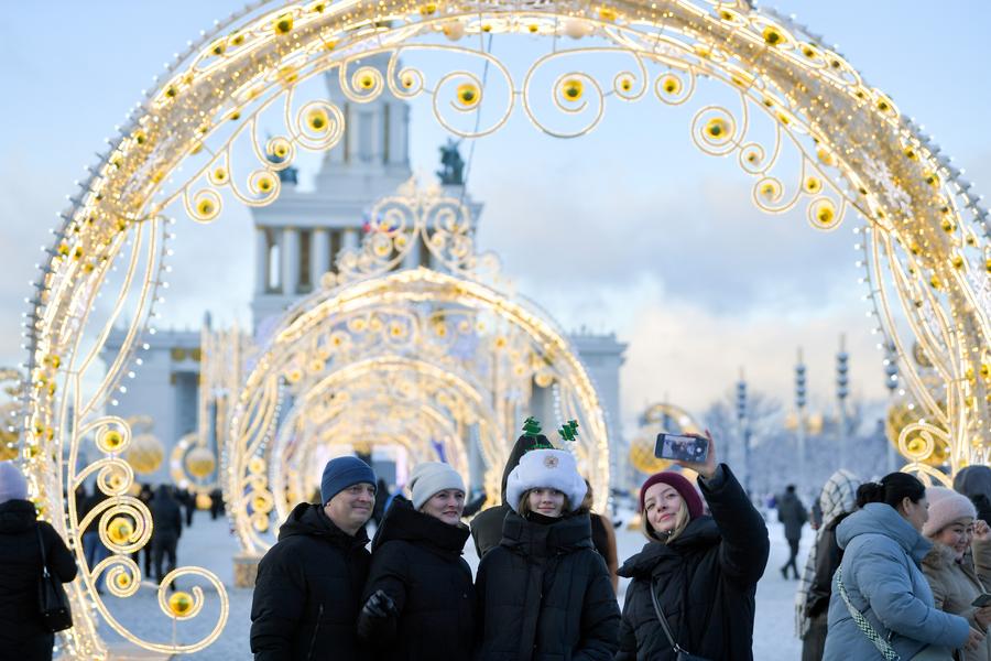 2024年12月31日,人們在俄羅斯首都莫斯科的新年裝飾前自拍。新華社發(亞歷山大攝)