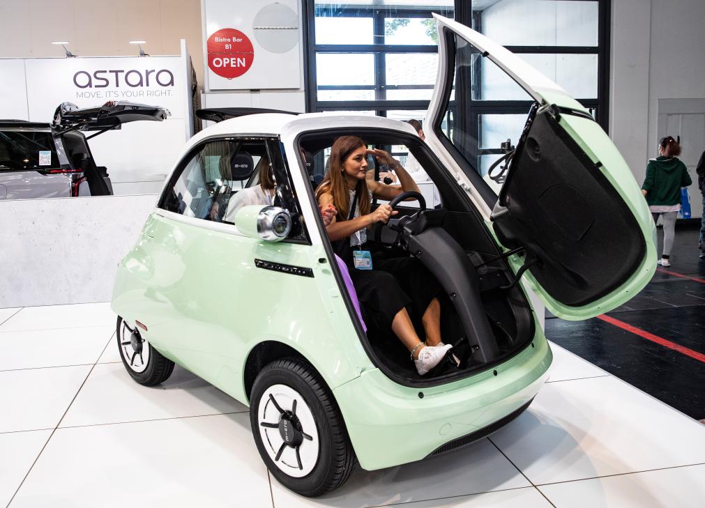 2023年9月5日,在德國慕尼黑,人們在德國國際汽車及智慧出行博覽會上體驗一款小型新能源車。新華社記者張帆攝