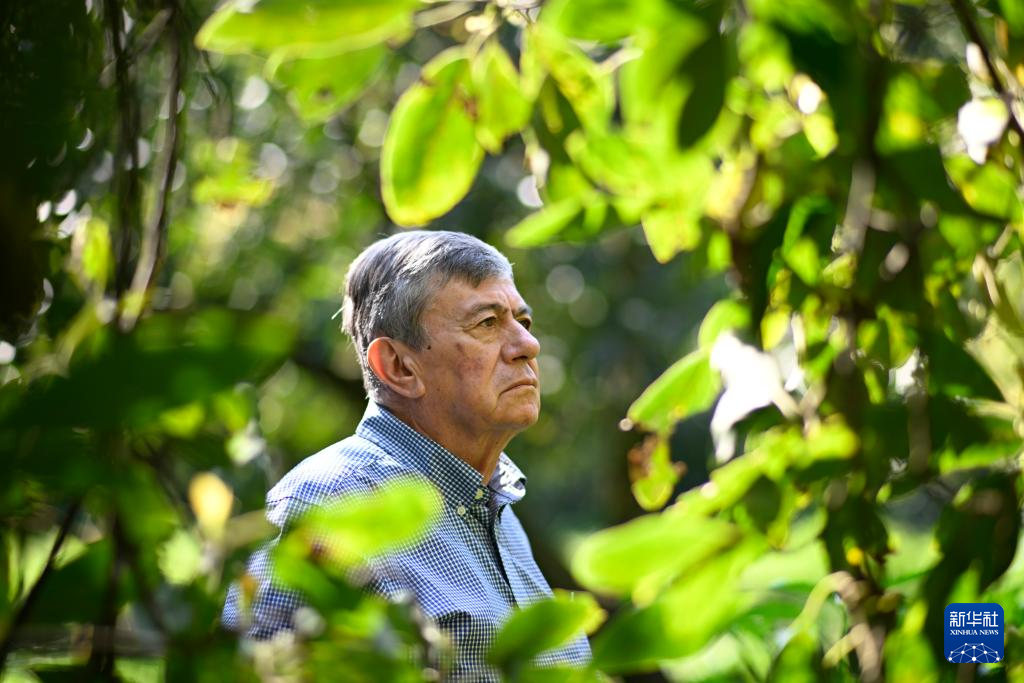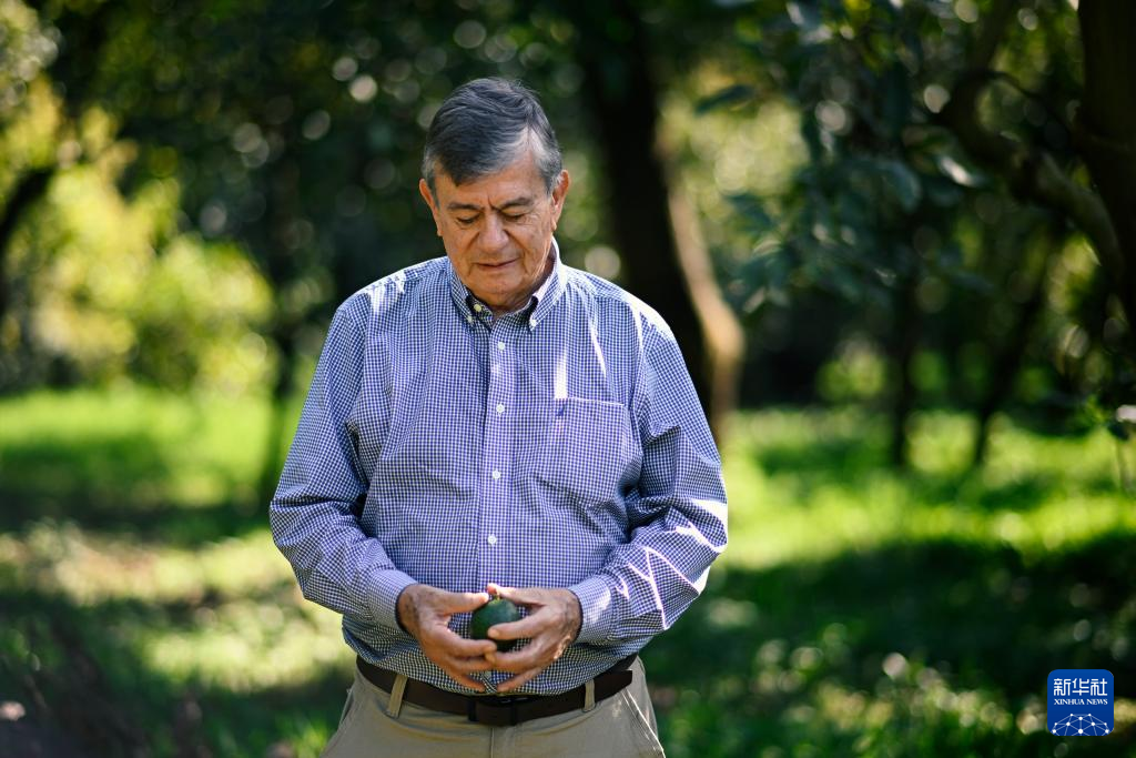 12月6日,在墨西哥米卻肯州烏魯阿潘市,農場主恩里克·包蒂斯塔站在牛油果樹叢中。新華社記者 李木子 攝