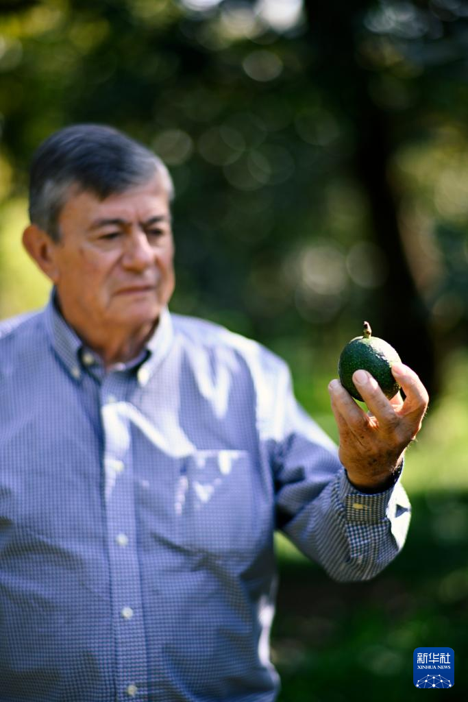 12月6日,在墨西哥米卻肯州烏魯阿潘市,農場主恩里克·包蒂斯塔注視著手中的一顆牛油果。新華社記者 李木子 攝