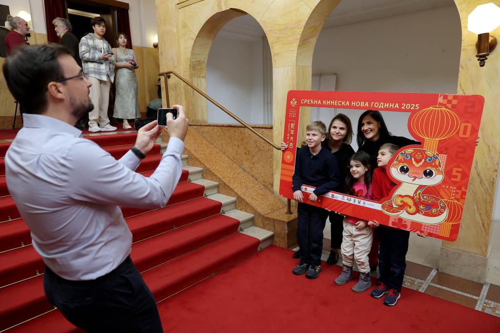 1月23日晚,人們在塞爾維亞貝爾格萊德“歡樂春節”活動現場拍照。新華社發(普雷德拉格·米洛薩夫列維奇攝)