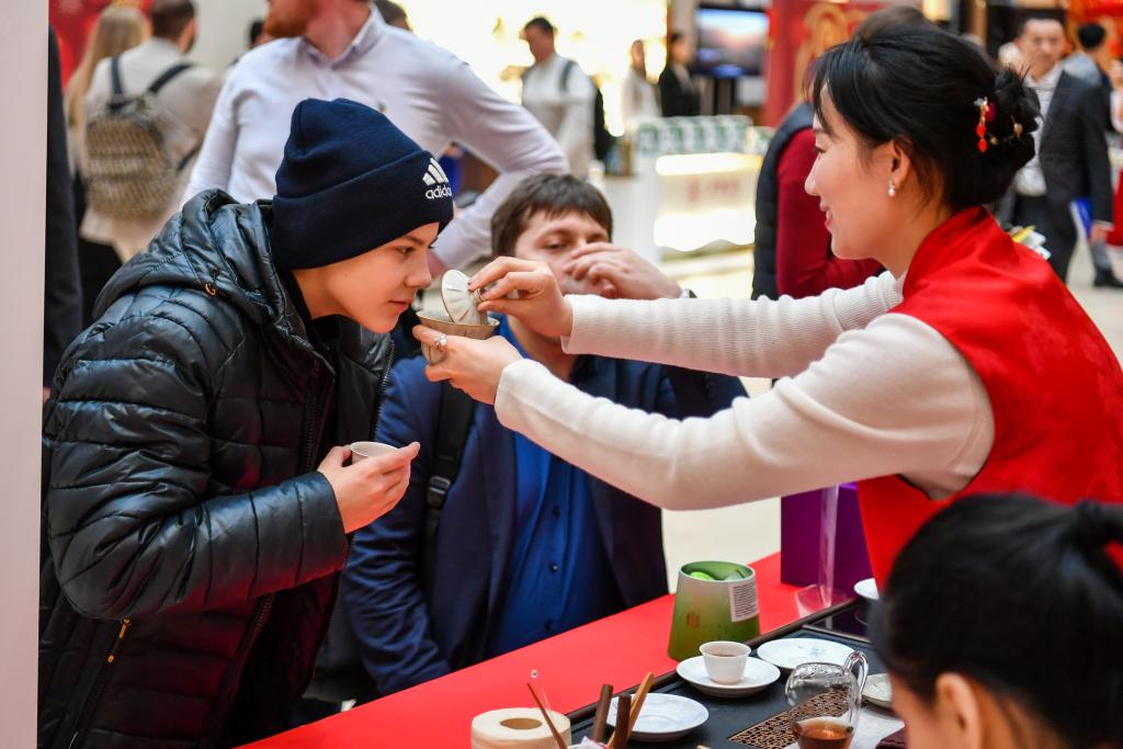 2025年1月28日,在俄羅斯莫斯科舉行的新春廟會活動上,游客在感受茶文化。新華社記者曹陽攝