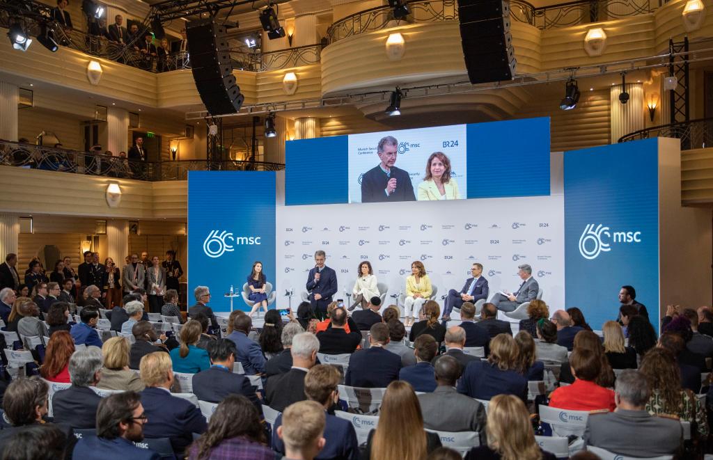2024年2月18日,慕安會主席克里斯托夫·霍伊斯根(中左二)在德國慕尼黑舉行的第60屆慕尼黑安全會議上發表閉幕致辭。新華社記者 張帆 攝