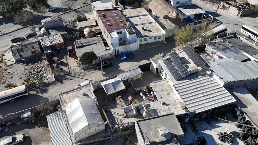 這是2025年2月2日在墨西哥奇瓦瓦州華雷斯城拍攝的一處移民收容所(無人機照片)。新華社記者李夢馨攝