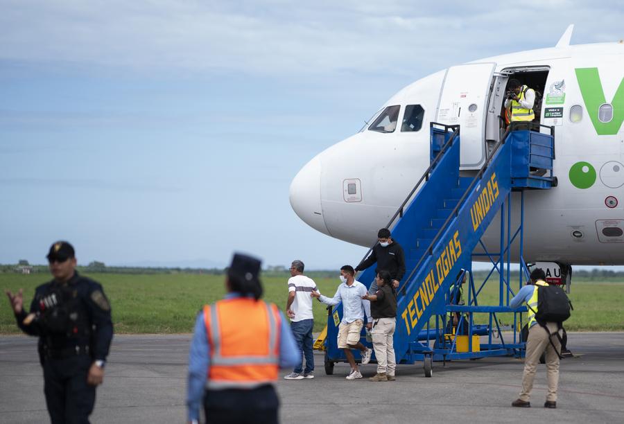 2025年2月13日,在洪都拉斯拉利馬市,被遣返移民抵達機場。新華社發(戴維攝)