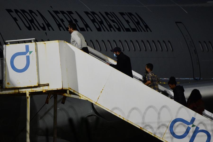 2025年2月7日,在巴西東北部塞阿拉州福塔萊薩市,被美國驅逐出境的第二批巴西非法移民登上一架巴西空軍飛機。新華社發(盧西奧·塔沃拉攝)