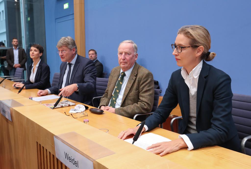 2017年9月25日,在德國首都柏林,魏德爾(右一)出席德國選擇黨新聞發布會。新華社記者單宇琦攝