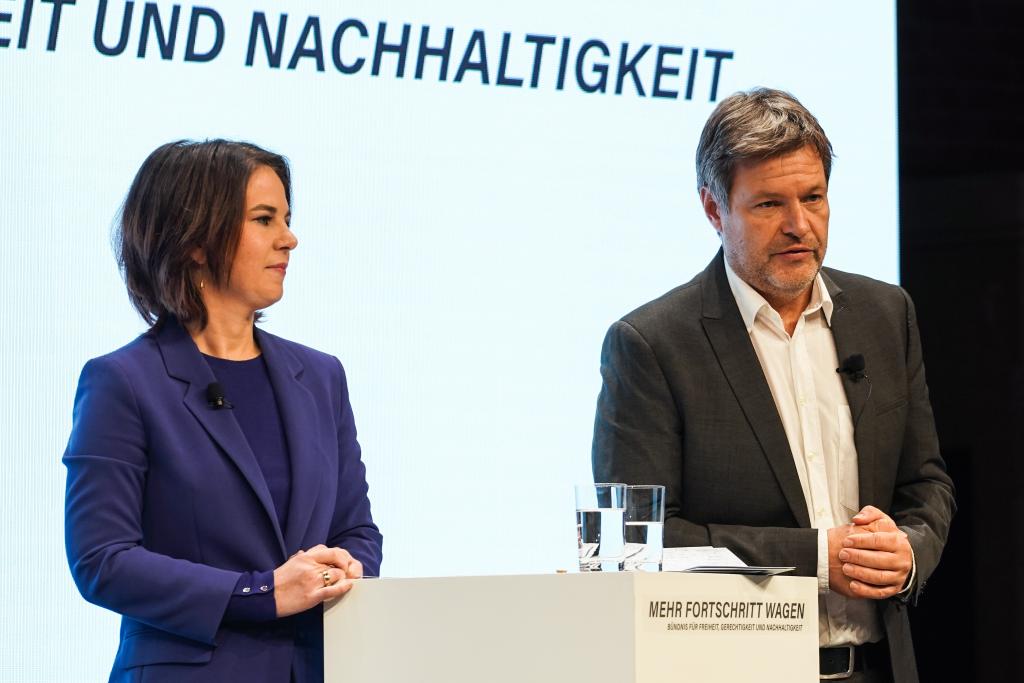 2021年11月24日,在德國首都柏林,哈貝克(右)與綠黨聯席主席貝爾伯克出席新聞發布會。新華社發(斯特凡·蔡茨攝)