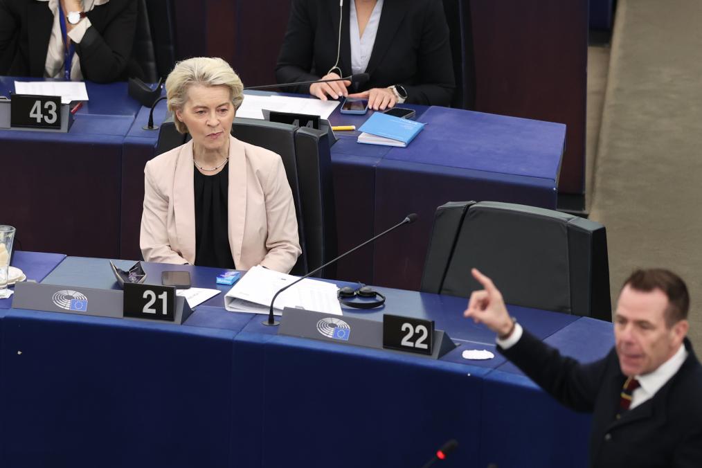 2024年11月27日,在法國斯特拉斯堡,馮德萊恩(左)出席歐洲議會會議。新華社記者趙丁喆攝