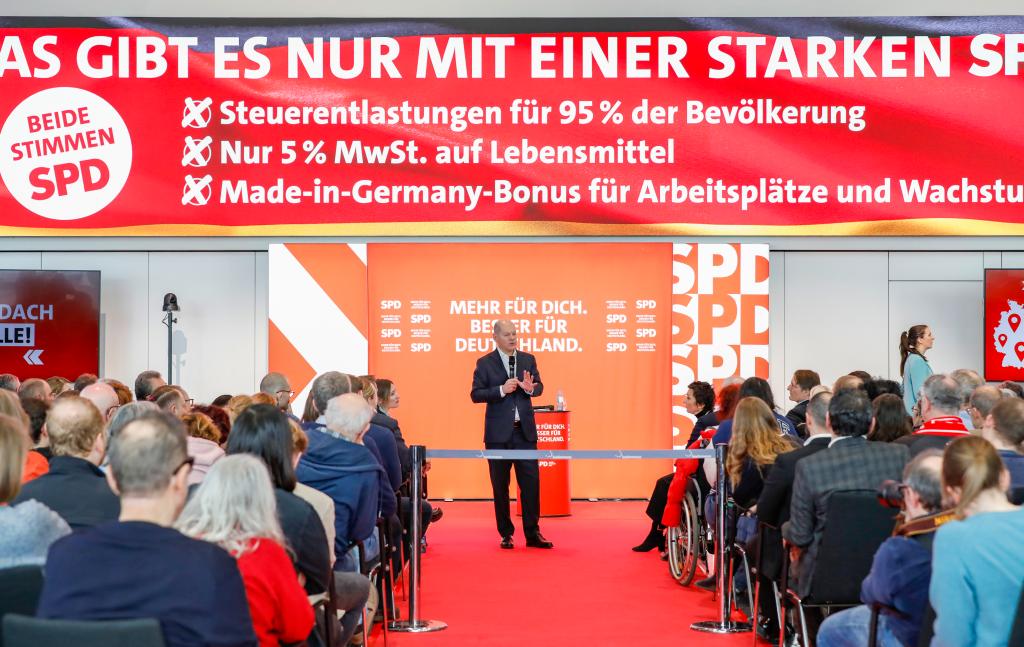 2月21日,在德國科隆,德國社會民主黨(社民黨)總理候選人、現任總理朔爾茨在競選集會上講話。新華社記者張帆攝
