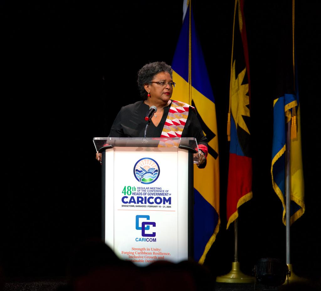 2025年2月19日,在巴巴多斯首都布里奇敦,加勒比共同體(加共體)輪值主席、東道國巴巴多斯總理莫特利在加共體第48屆政府首腦會議開幕式上發言。新華社記者 蔣彪 攝