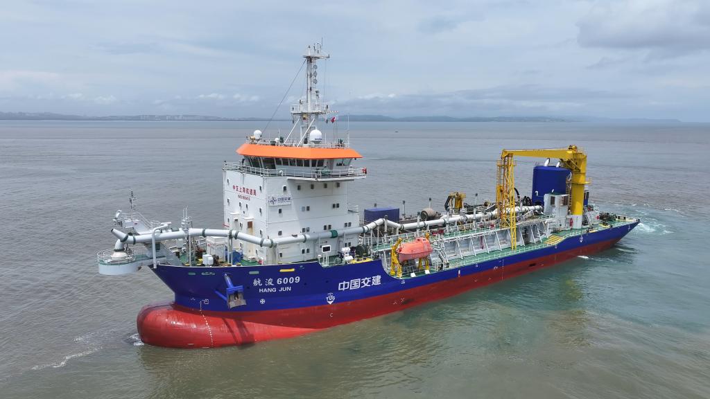 2024年6月6日,在哥倫比亞巴蘭基亞,中交上海航道局的“航浚6009”輪在馬格達萊納河入海處作業。新華社發(中交上海航道局供圖)