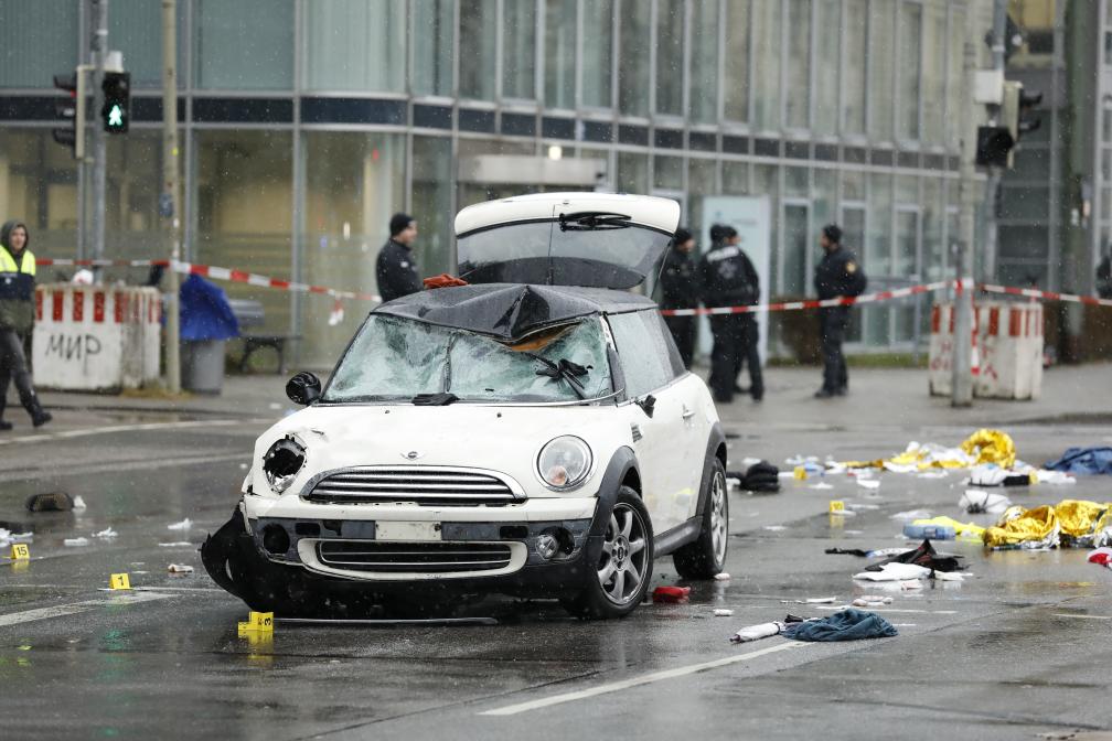 這是2月13日在德國慕尼黑的車輛沖撞人群事件現場拍攝的受損車輛。德國警方13日說,當天上午,德國慕尼黑城區發生車輛沖撞人群事件,數人受傷。新華社記者張帆攝