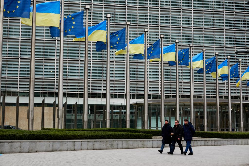 2025年2月24日,在比利時布魯塞爾,人們走過歐盟總部。新華社記者孟鼎博攝