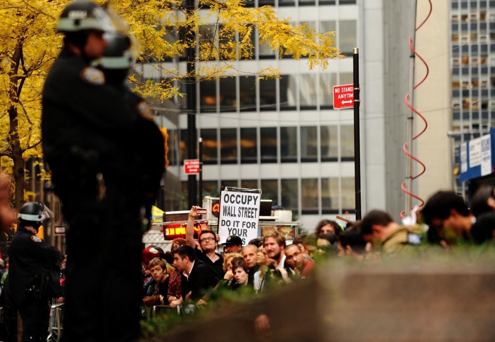2011年11月15日,在美國紐約,警察在祖科蒂公園與示威者對峙。(新華社記者申宏攝)
