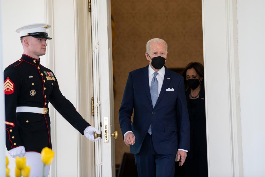 2022年4月11日,時任美國總統拜登(左二)準備在華盛頓白宮發表講話。(新華社記者劉杰攝)