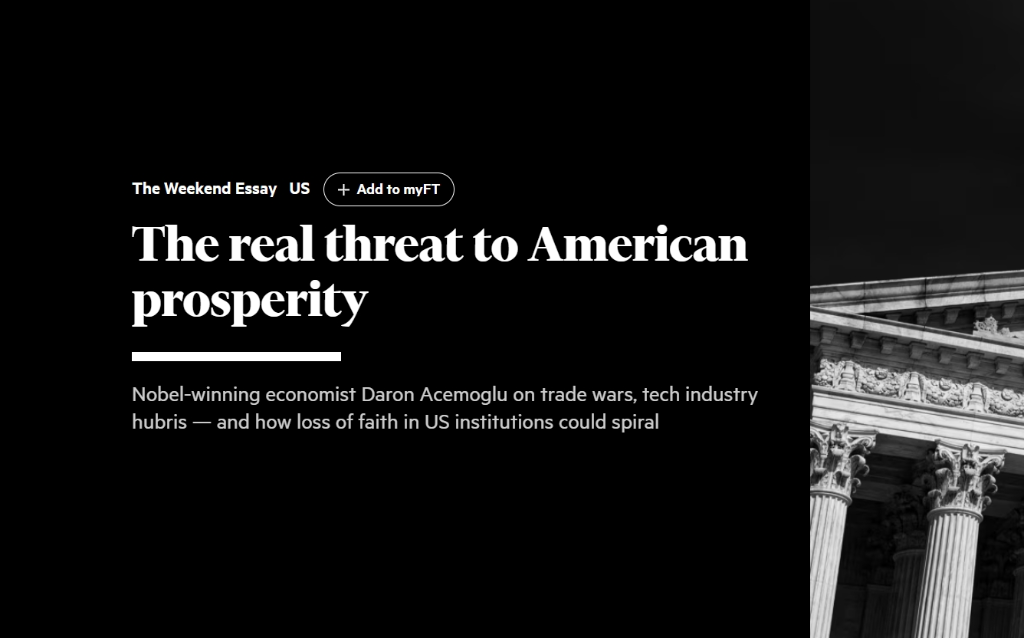 英國《金融時報》網站近期發表美國麻省理工學院教授、諾貝爾經濟學獎得主達龍·阿杰姆奧盧的一篇文章,題為《美國繁榮的真正威脅》。內容摘要如下: