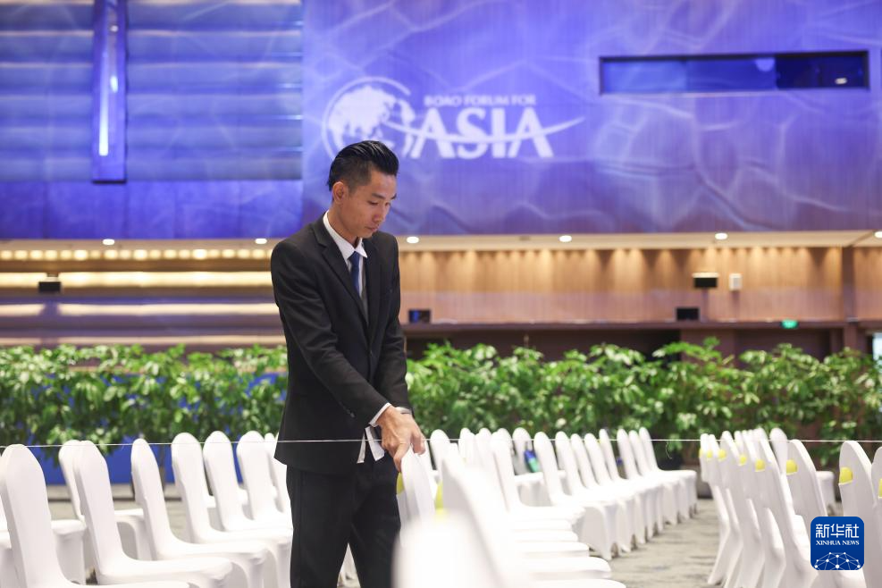 3月24日,工作人員在博鰲亞洲論壇主會場進行準備工作。