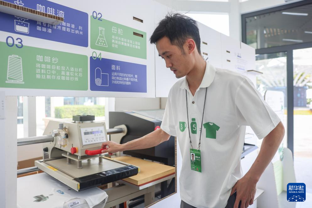 3月25日,工作人員在演示制作低碳“咖啡衫”。