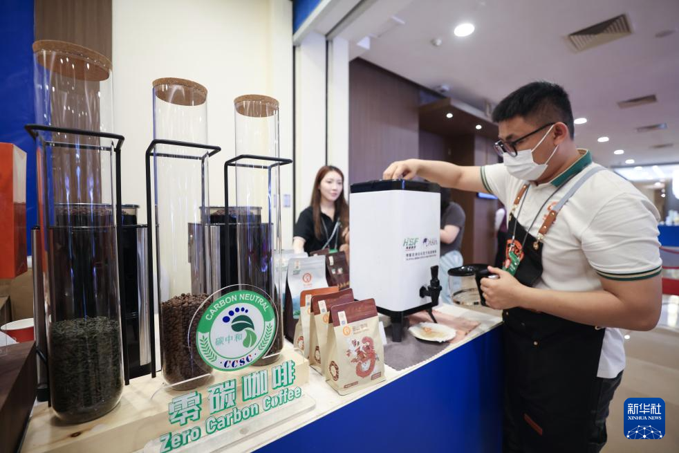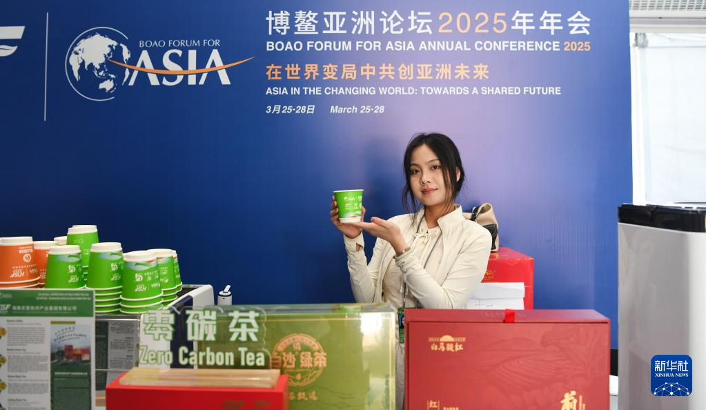 這是3月26日拍攝的在博鰲亞洲論壇新聞中心海南農墾熱作產業集團有限公司展示的經碳中和認證的茶產品。