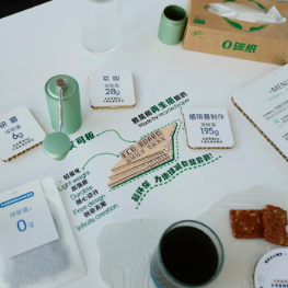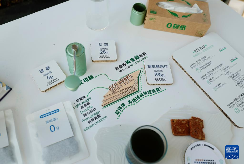 3月26日在博鰲亞洲論壇2025年年會會場外的休息區拍攝的一個桌面上的“零碳”信息。