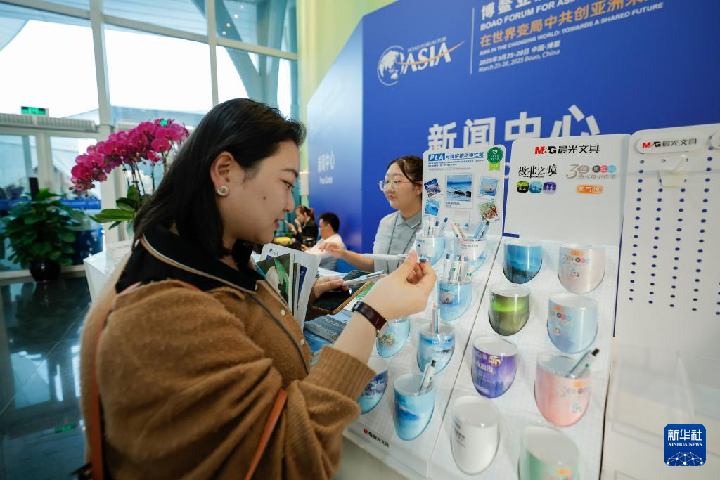 3月26日,在博鰲亞洲論壇2025年年會新聞中心,一名媒體工作者在領取可降解按動中性筆。