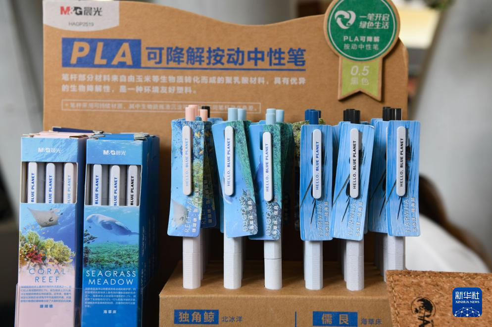 這是3月25日在博鰲零碳示范區內展示的可降解按動中性筆。