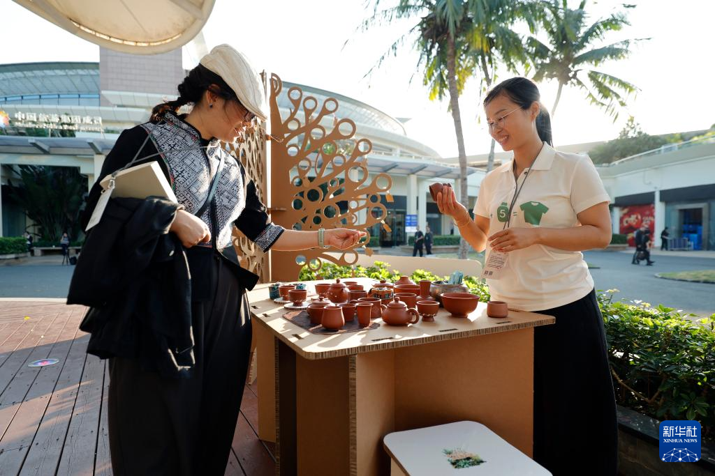 3月26日,在博鰲亞洲論壇2025年年會會場外的休息區,兩名手藝人在整理陶藝展品。這里所用的桌椅都是由可再生紙制作的紙板制成。