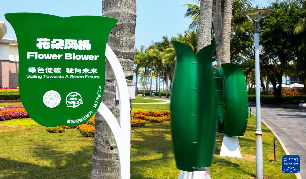 3月26日在博鰲亞洲論壇2025年年會會場外拍攝的花朵風機?;ǘ滹L機用來收集風能,是島內可再生能源利用項目之一。