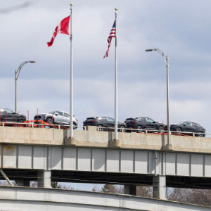 4月9日,在加拿大安大略省尼亞加拉瀑布市加美邊境地帶,一輛滿載的汽車運輸車通過劉易斯頓-昆斯頓橋開往加拿大。新華社發(鄒崢攝)