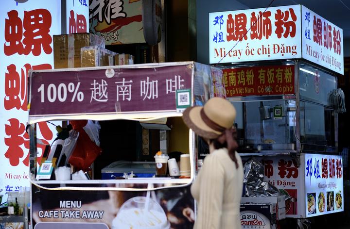 這是在中國東興口岸拍攝的街景。中越兩國游客在這里品嘗特色美食、咖啡。新華社記者 鄭開君 攝