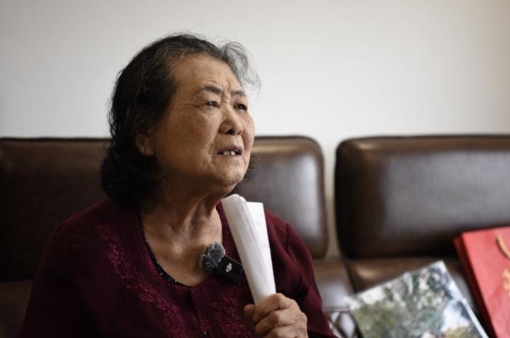 采訪中,陳明月老人把紙卷成“麥克風”向記者演唱《康定情歌》。新華社記者 宿亮 攝