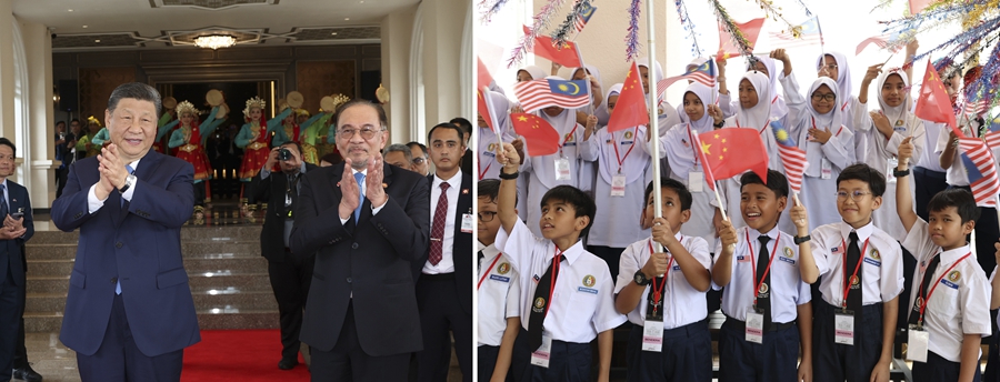 習近平乘車抵達總理官邸時,安瓦爾熱情迎接。馬來西亞青少年揮舞兩國國旗,奏響歡快的鼓樂,跳起熱情的民族舞蹈,熱烈歡迎遠道而來的貴賓。