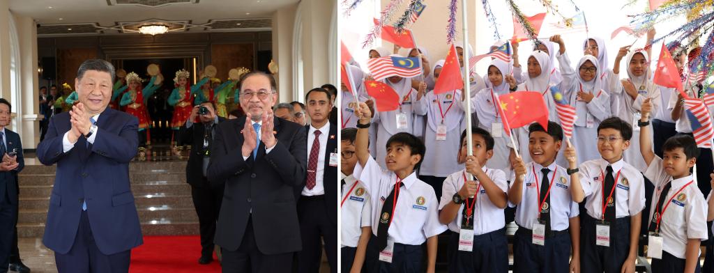 4月16日下午,中國國家主席習近平乘車抵達馬來西亞總理官邸時,馬來西亞總理安瓦爾熱情迎接。馬來西亞青少年揮舞兩國國旗,奏響歡快的鼓樂,跳起熱情的民族舞蹈,熱烈歡迎遠道而來的貴賓(拼版照片)。新華社記者 黃敬文 攝