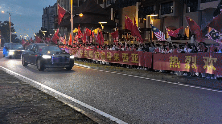 習近平乘車從機場赴下榻飯店途中,當地中資企業人員、留學生在道路兩旁揮舞中馬兩國國旗,高舉“熱烈歡迎習近平主席訪問馬來西亞”、“中馬友誼萬歲”等紅色橫幅,華僑華人表演喜慶熱烈的舞獅,歡迎習近平到訪。