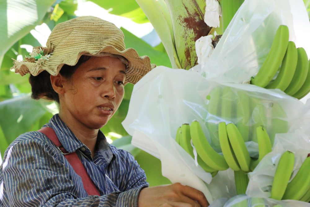 2020年7月17日,工人在柬埔寨桔井省的柬埔寨-中國熱帶生態農業合作示范區給香蕉套袋。